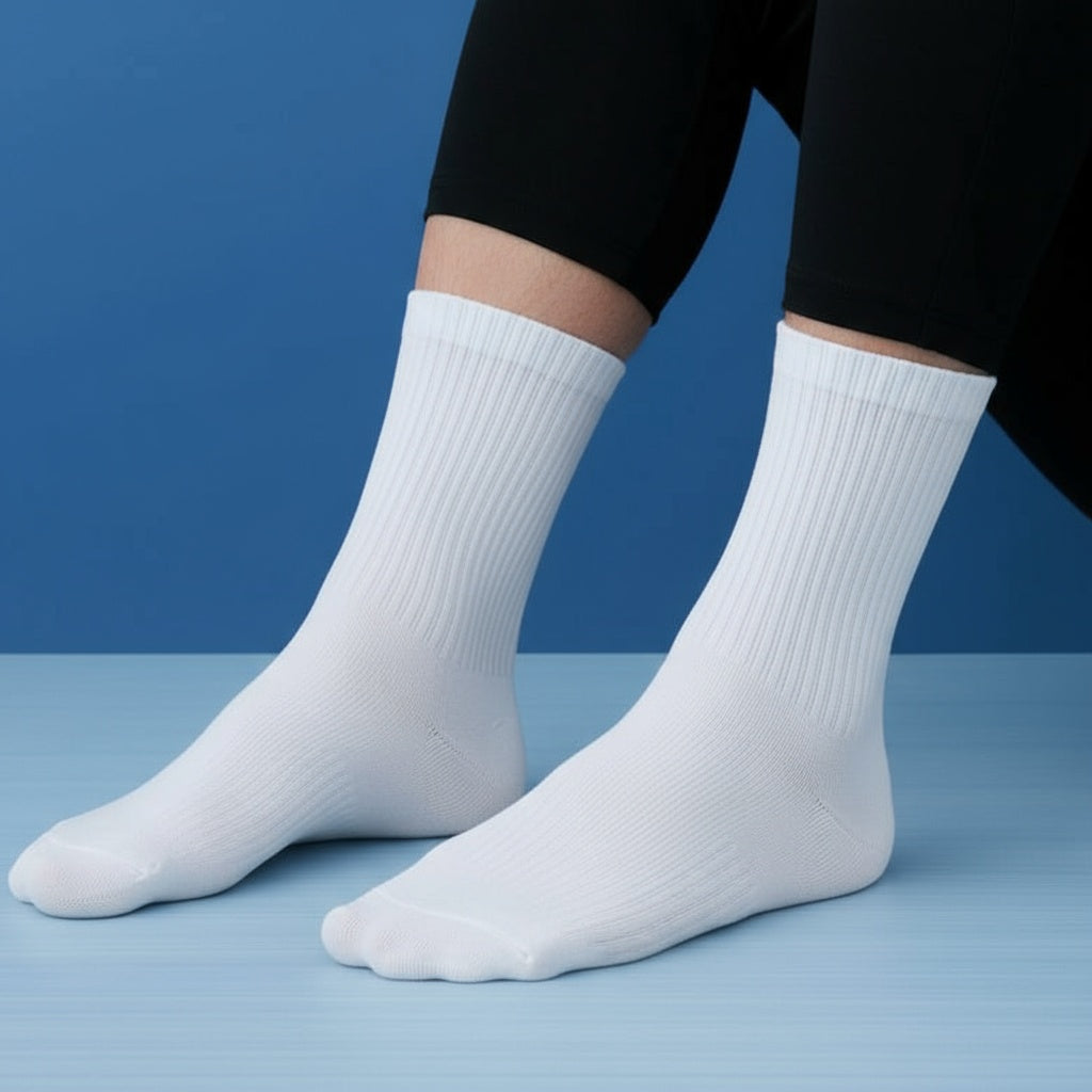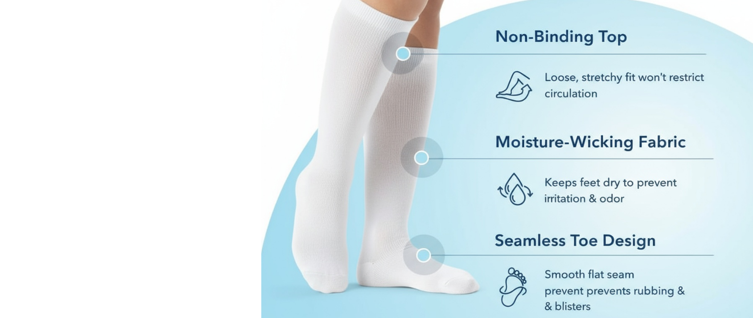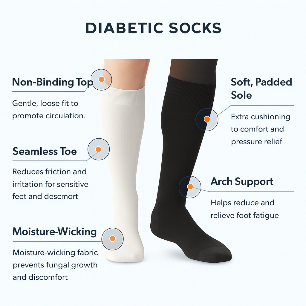 On the other hand, diabetic socks are tailored to protect the sensitive feet of individuals with diabetes by using non-binding, moisture-wicking, and seamless designs to prevent complications like foot ulcers and infections, without restricting blood flow.