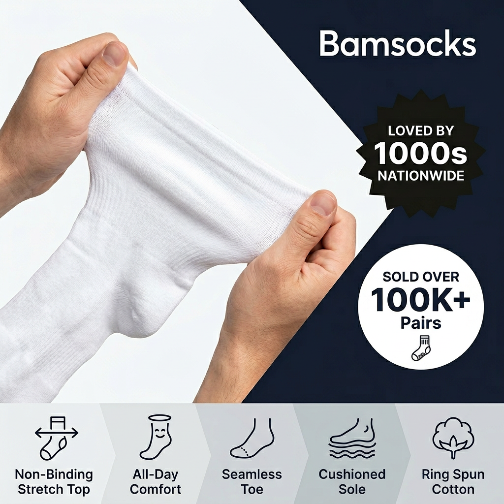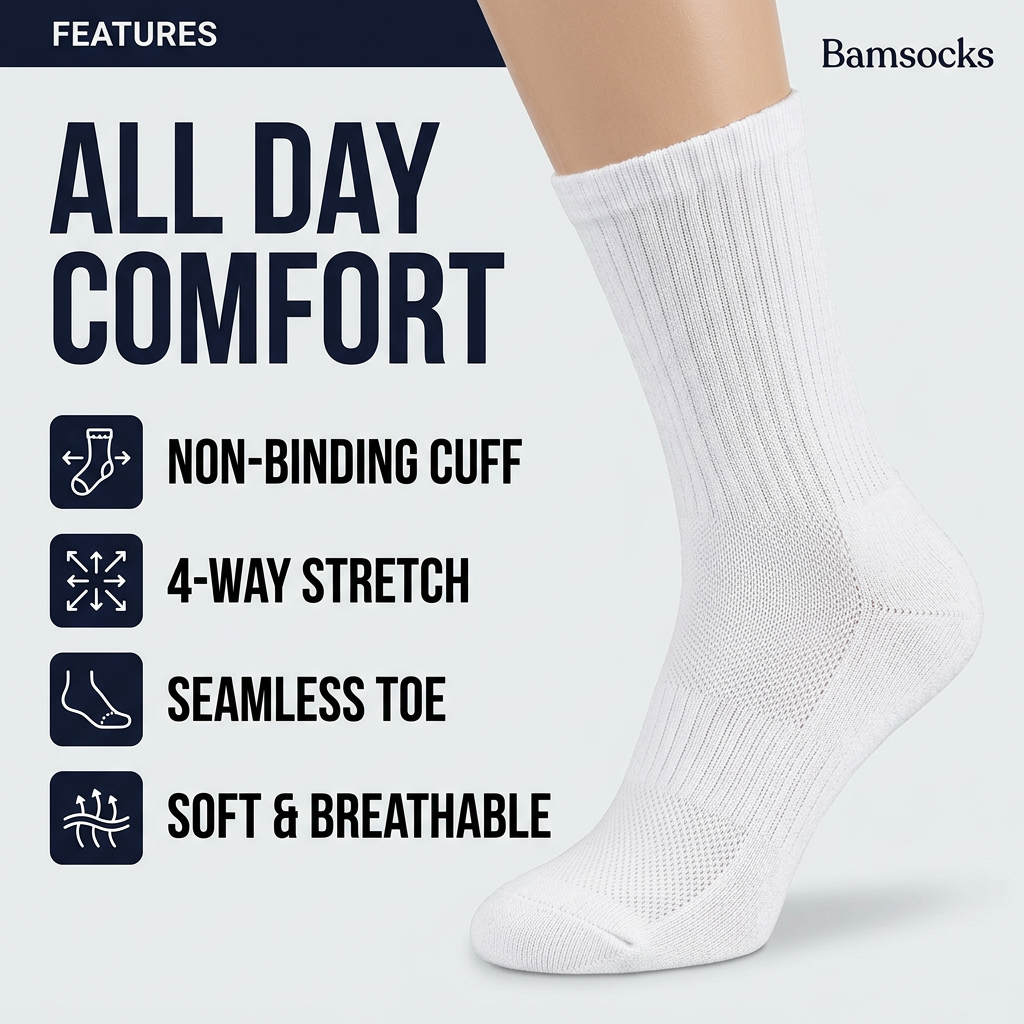 Diabetic socks are specifically designed with features that protect sensitive feet. They have non-binding, loose-fit tops that won't restrict circulation, extra cushioning on the sole to prevent blisters and pressure points, seamless or ultra-smooth toe seams to avoid irritation, and moisture-wicking materials to keep feet dry and reduce infection risk.
